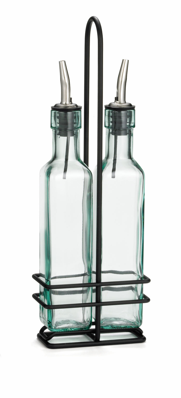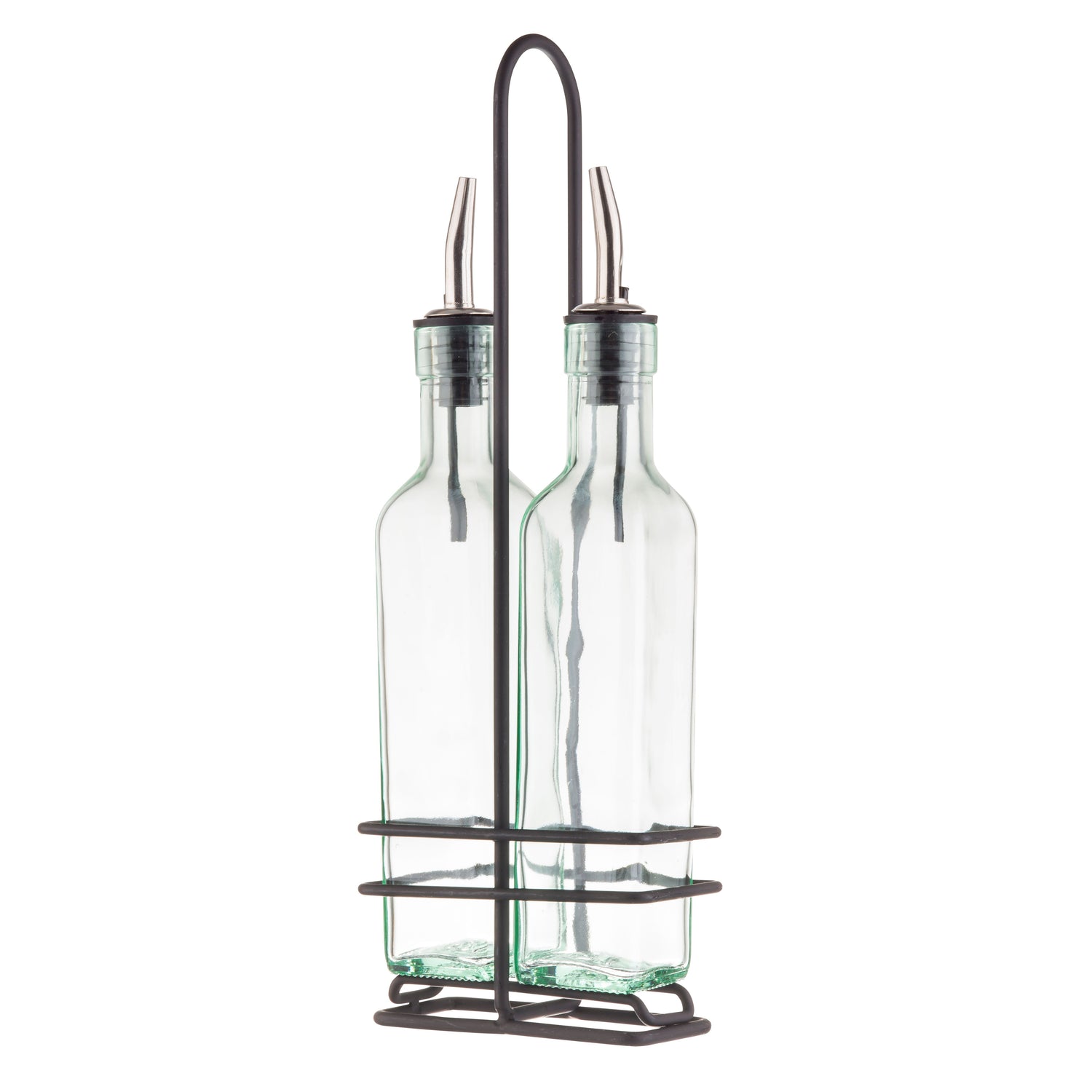Two green tint glass bottles with stainless steel pourers sit side by side in a chrome plated rack with a handle. The square bottles are often used for oil and vinegar on kitchen tables, adding both function and style to your dining experience.