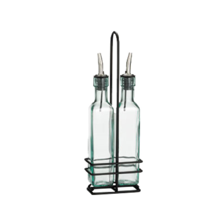 TableCraft Products, H9085NBK, Cash & Carry Prima™ Set, (2) 8-1/2 oz. square green tint glass bottles (dishwasher safe), stainless steel pourer (hand wash only), black powder coated metal rack (hand wash only) (must be purchased in multiples of 6 sets) (Packed By: 6 Each Per Case)