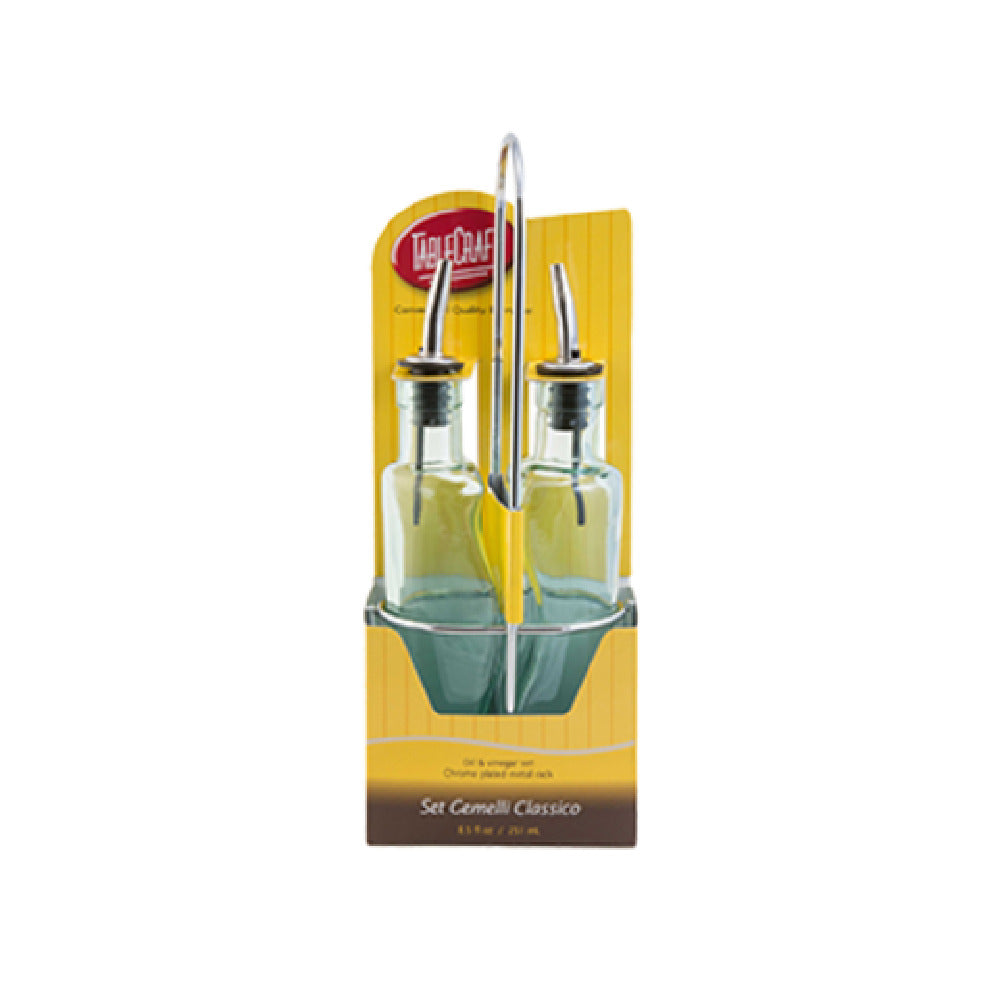 The Tablecraft H918N Gemelli™ Bottle Set offers commercial-grade durability with dishwasher-safe glass bottles and stainless steel pourers for ease of cleaning. The chrome-plated rack ensures organized storage in condiment areas, supporting efficient workflow. Designed for multi-set purchases, it meets the demands of busy foodservice operations, providing reliable, controlled pouring and swift restocking. The precise construction aids in maintaining sanitation and operational efficiency during high-volume use.