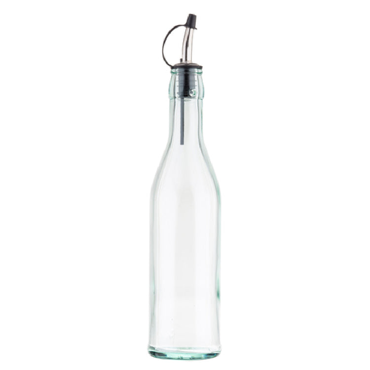The H92007 oil and vinegar cruet offers a stainless steel pourer with a tethered cap for secure closure, enhancing hygiene and reducing misplacement. The green glass provides chemical resistance and UV protection, extending product shelf life. Its 17 oz. capacity supports moderate throughput, suited for tabletop or prep station use. Designed for ease of refilling and cleaning, it integrates seamlessly into busy kitchen workflows, ensuring reliable condiment dispensing in commercial settings.