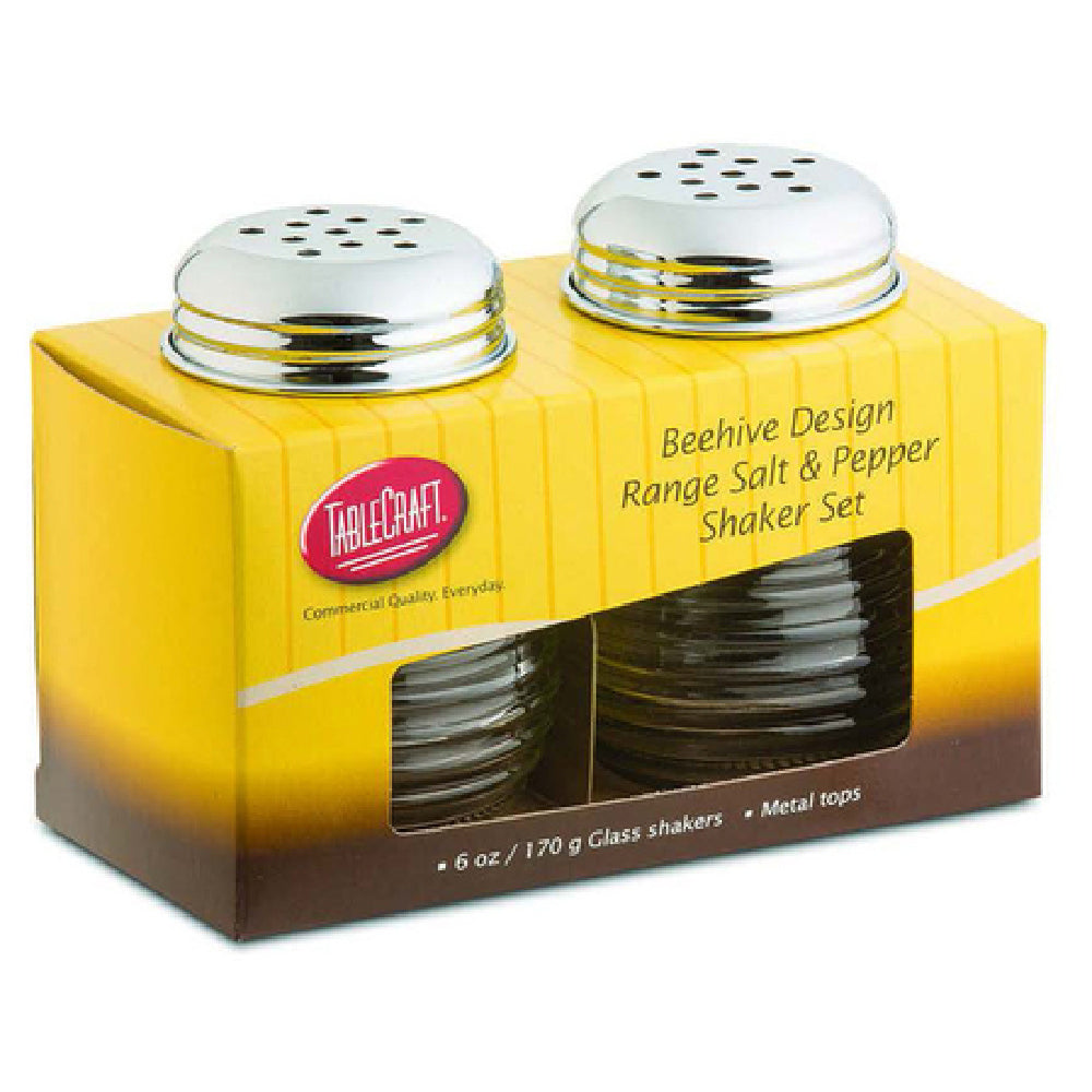 TableCraft Products, HBH4C, Cash & Carry Beehive Collection™ Salt & Pepper Shakers Set, 6 oz., 3-1/4" x 2-7/8" x 5-3/4", glass, dishwasher safe, chrome plated tops (must be purchased in multiples of 6 sets)