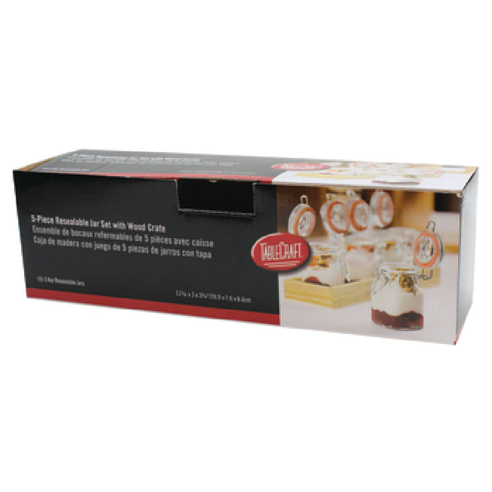 TableCraft Products, HFLGLASS5, Cash & Carry Tasting Flight Set, includes: (1) 11-3/8" x 3 x 3-3/8" wood crate (hand wash only), and (5) 2.4 oz. clip-top lid glass jars (must be purchased in multiples of 4 sets)