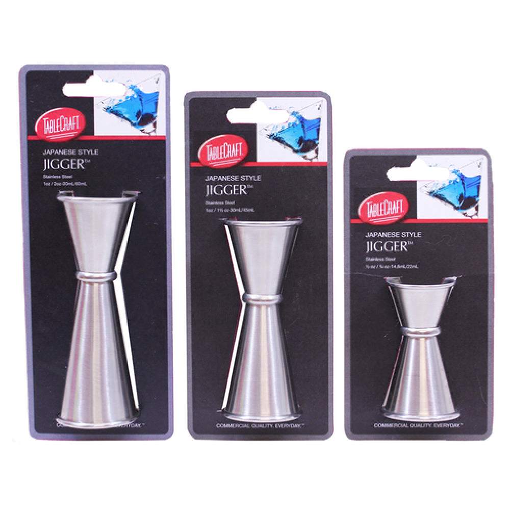 A commercial jigger is a stainless steel measuring tool used in professional bar and kitchen settings to accurately portion liquids, typically in 1 oz. and 1-1/2 oz. sizes. Designed for high durability and repeated dishwashing, the Tablecraft JJ1205 Japanese Jigger is employed for precise beverage preparation—installed in bar stations and beverage service areas—making it ideal for high-volume cocktail service in hospitality venues or busy restaurants where measurement consistency is essential.