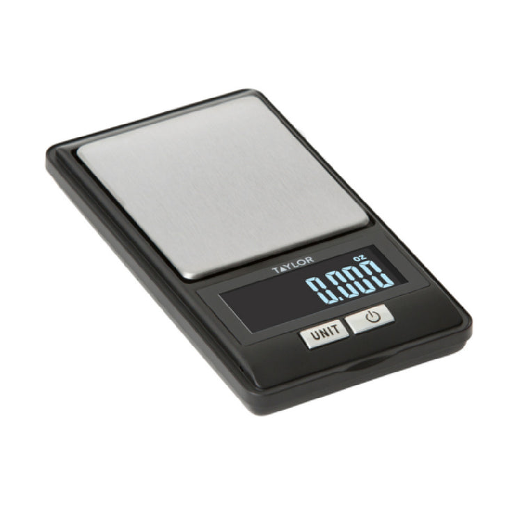 The Taylor 1250BKT21 Digital Kitchen Scale is a precision measurement device designed for professional foodservice environments. It features a compact, rectangular stainless steel platform with a weight capacity of 16 ounces (approximately 0.005 ounces accuracy) and a maximum of 500 grams (0.01 grams accuracy). This scale includes an invertible weighing tray that functions as a protective cover, optimizing space efficiency in busy kitchens. The device is powered by two AAA batteries, included, and engineered for durability and ease of cleaning, making it suitable for high-frequency commercial use in food prep, bakery, or confectionery applications. Its precise load cell and stainless steel construction ensure consistent measurements vital for recipe accuracy and portion control in culinary settings.
