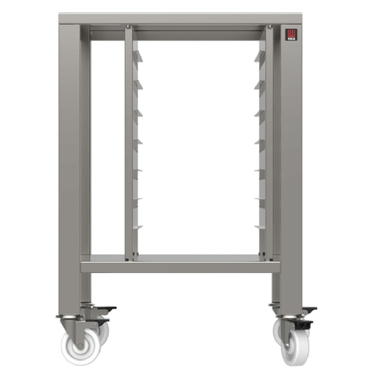 The Tecnoeka EKTARS 412 stainless steel table with casters defines durable, efficient work surfaces designed for commercial kitchens and foodservice operations. Measuring 24.02 inches in width, 24.8 inches in depth, and 34.76 inches in height, this stand features lateral supports capable of accommodating up to seven half-size (18" x 13") trays for Evolution ovens. Its sturdy stainless steel construction ensures long-lasting performance in high-traffic environments, providing a reliable platform for food prep, equipment placement, and workflow optimization within professional foodservice settings.