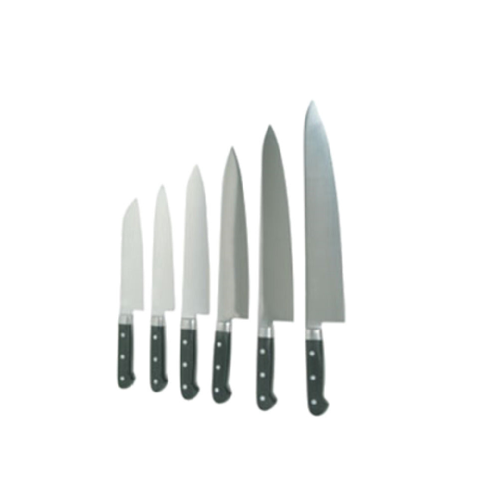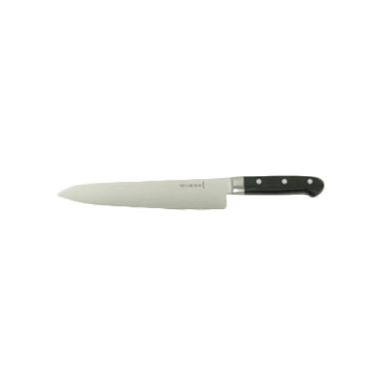 The Japanese Cow Knife excels in high-volume meat slicing, featuring a 7" to 9" stainless steel forged blade optimized for precise cuts. Its riveted ABS handle offers durability and ease of maintenance, making it suitable for heavy-duty commercial kitchens. Perfect for butchery, deli, and prep stations, the knife’s smooth edge ensures clean slices, reducing prep time and waste, thus improving workflow efficiency for professional culinary teams.