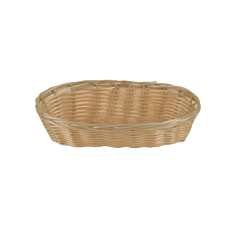 This plastic oblong basket provides a robust, woven construction optimized for commercial foodservice use, ensuring break resistance under frequent handling. Its stackable design enhances storage efficiency, while the natural tan color offers versatile presentation. It is easy to clean and maintain, fitting seamlessly into tabletop service, prep stations, or display areas. Its precise dimensions support standard portion or display applications, facilitating workflow integration during moderate throughput operations.