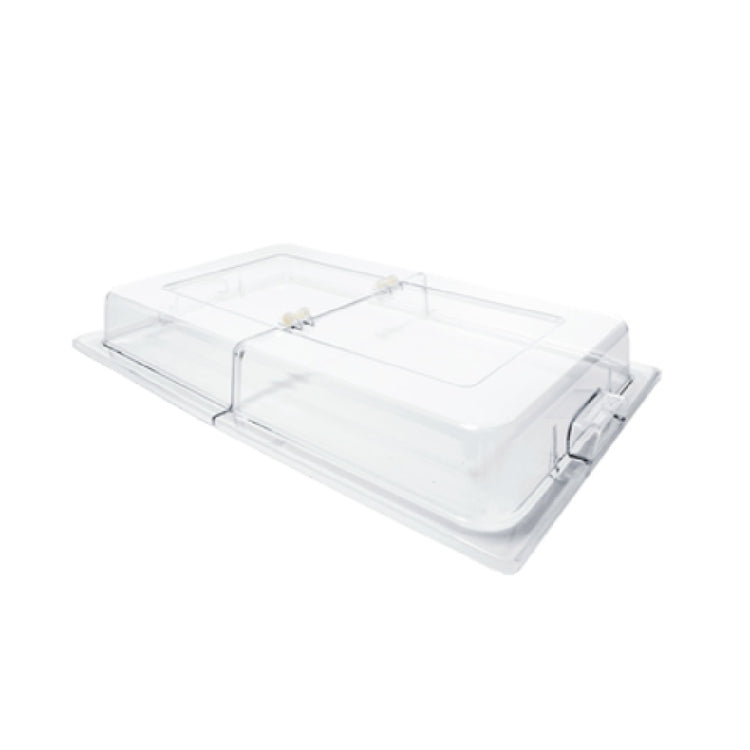 The Thunder Group PLRCF001H Chafer Dome Cover Rectangular Hinged is a commercial-grade foodservice accessory designed for full-size 8 qt. chafers. Constructed from durable polycarbonate, this clear, rectangular lid features hinged operation and dual-sided handles, providing a secure fit for professional buffets and catering environments. Its high-impact plastic ensures longevity while maintaining visibility for easy identification of contents, making it suitable for restaurant, catering, and banquet service.