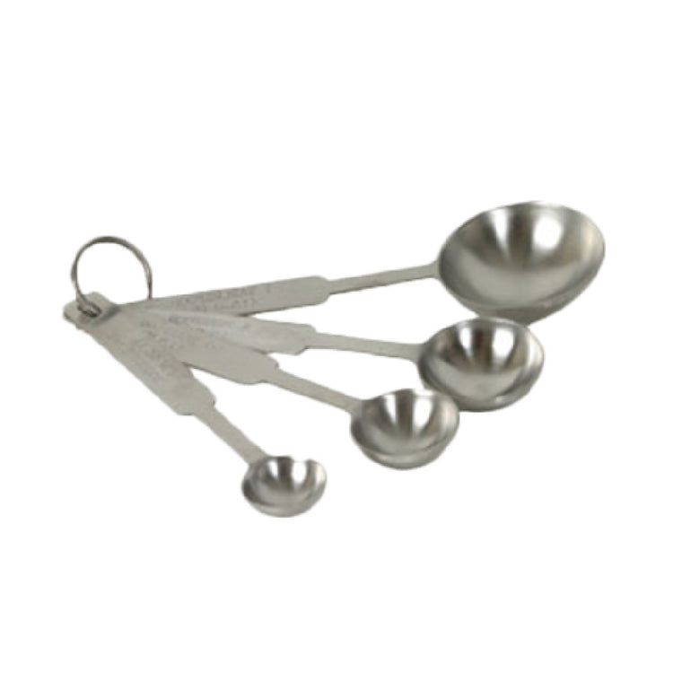The measuring spoon set features four precise, stainless steel measures with a polished finish, designed for durability and easy cleaning. Its ergonomic bowl design ensures comfortable handling during rapid or repetitive use, suitable for professional kitchens. The set’s compact size aligns with space-efficient storage and seamless workflow integration, ideal for high-volume prep lines. Each measure’s precise calibration supports accurate portioning in culinary processes, reducing waste and ensuring consistency. The stainless steel material withstands frequent washing, temperature variations, and rigorous sanitation practices prevalent in commercial kitchens.