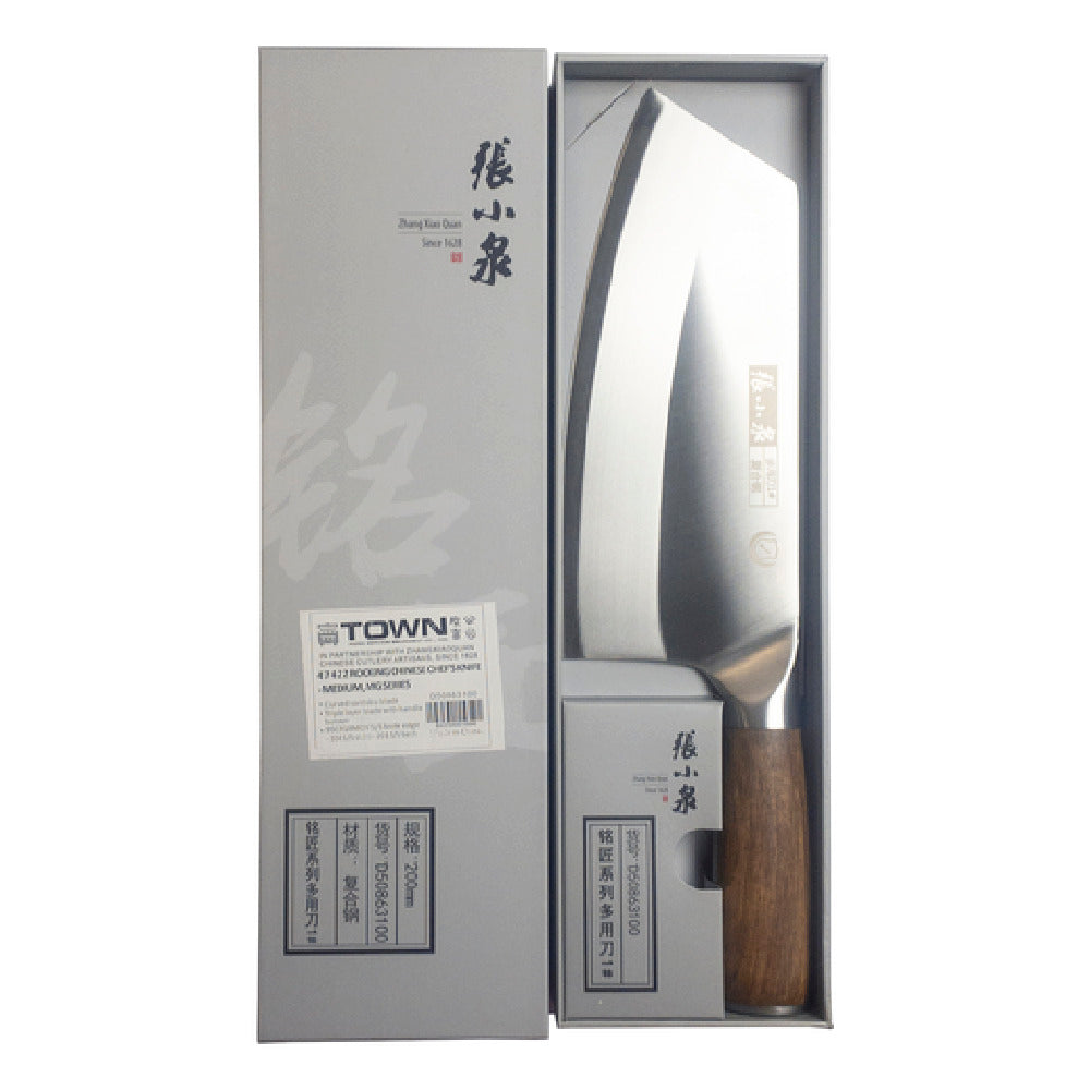 The Town 47422/DZ Zhang Xiao Quan Medium Rocking Chef's Knife is a professional-grade culinary tool designed for precise slicing and chopping. Featuring an 8-inch by 3-1/4-inch forged blade crafted from corrosion-resistant triple-layer stainless steel, this knife offers optimal durability and edge retention. Its 12-1/2-inch overall length and ergonomic design make it suitable for high-volume commercial kitchens, enabling efficient workflow in fine dining, catering, and food prep environments. Engineered to withstand rigorous use, it ensures consistent performance across demanding culinary operations and facilitates swift, accurate food preparation.