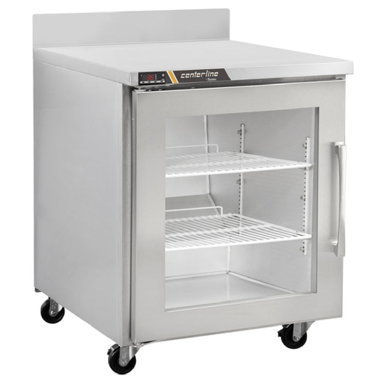 Traulsen, CLUC-27R-GD-WTL, Centerline™ Compact Undercounter Refrigerator with Work Top, 27"W, 6.5 cu. ft. capacity, self-contained rear-mount refrigeration, (1) left hinged glass door (field reversible), electronic control with LED display, (2) epoxy coated shelves per section, 4" backsplash, stainless steel exterior, anodized aluminum interior, (4) casters, R290 Hydrocarbon refrigerant, 1/5 HP, 115v/60/1-ph, 2.4 amps, NEMA 5-15P, cETLus, ETL-Sanitation, ENERGY STAR®