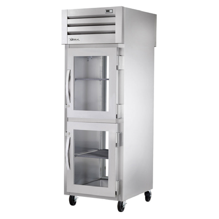 The True Refrigeration STR1RPT-2HG-1G-HC SPEC SERIES® Refrigerator Pass-thru is a commercial-grade, self-contained refrigeration unit designed for high-efficiency foodservice environments. This one-section pass-thru features a stainless steel front and sides, with an all stainless steel interior, optimizing durability and sanitation. Equipped with two glass half doors at the front and a glass door at the rear, all with locks, it facilitates seamless workflow between kitchen and service areas. With a 1/4 HP hydrocarbon refrigerant system, this model ensures eco-friendly cooling while maintaining precise temperature control via a digital interface. Its dimensions of 27.5 inches in width by 36.13 inches in depth and 77.75 inches in height make it suitable for moderate-volume operations, making it ideal for restaurant prep stations, cafeteria lines, or convenience stores. The unit includes an interior kit, LED interior lighting, cam-lift hinges, and five-inch castors for mobility. Built in the USA, it is engineered for reliable performance in demanding foodservice applications, combining robust construction with energy-efficient cooling.