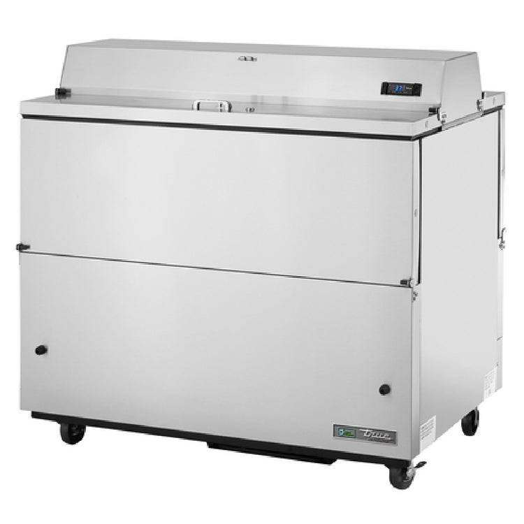 True Mfg. - General Foodservice, TMC-49-S-DS-HC, Mobile Milk Cooler, forced-air, (12) 13" x 13" x 11-1/8" crate capacity, dual sided stainless steel drop front/hold-open flip-up lids with locks, 33 - 38°F temperature range, (3) heavy-duty floor racks, digital thermometer, stainless exterior, aluminum interior with stainless steel floor, 4" castors, R290 Hydrocarbon refrigerant, 1/5 HP, 115v/60/1-ph, 2.7 amps, NEMA 5-15P, cULus, UL EPH Classified, Made in USA, ENERGY STAR®