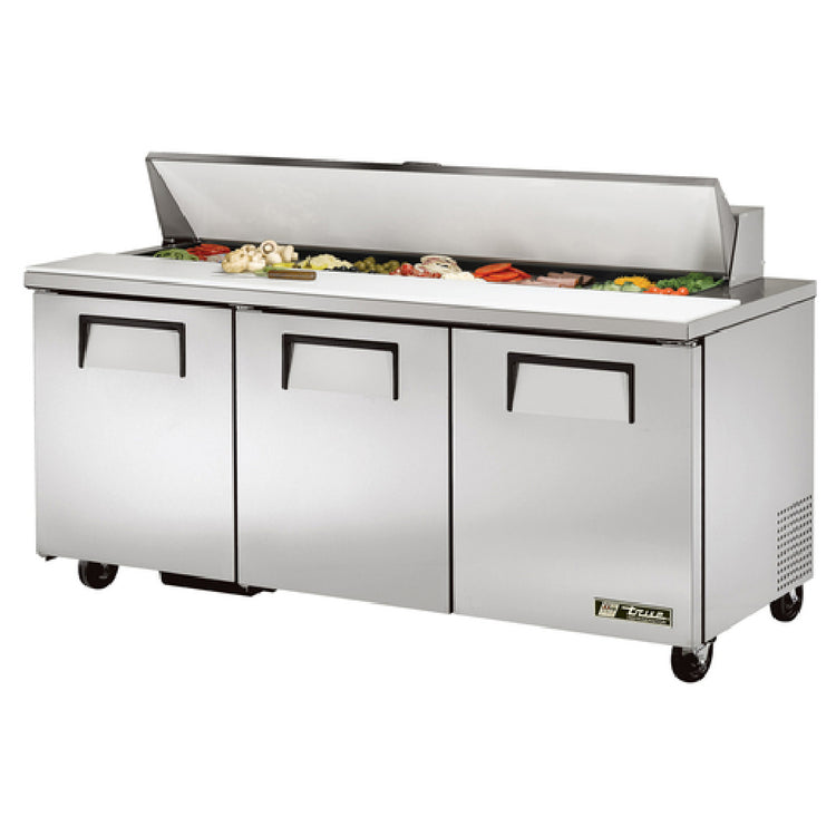 This true refrigeration sandwich unit provides specialized storage with three full doors and six PVC-coated adjustable wire shelves for flexible organization. Its stainless steel construction and insulated cover enhance durability and sanitation, simplifying cleaning and maintenance. The 72.38" wide footprint fits well in compact commercial kitchens, supporting streamlined workflow during high-volume service. Its built-in refrigeration maintains precise temperature control, ensuring product freshness for prepared foods requiring consistent cold storage.