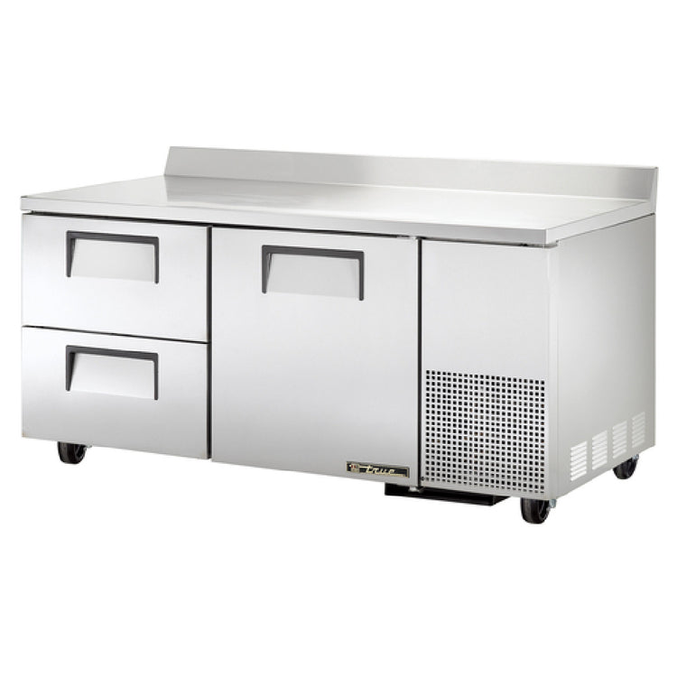 The True Refrigeration TWT-67D-2-HC_LH Deep Work Top Refrigerator Two-section is a commercial-grade refrigeration unit designed for high-performance foodservice environments. It features a sturdy stainless steel top with rear splash guard, stainless steel front and sides, and a self-contained refrigeration system with a side-mounted compressor operating at 1/10 HP. The unit offers two spacious sections with a total width of approximately 67.25 inches, utilizing adjustable PVC-coated wire shelves and drawers capable of accommodating two 12" x 20" x 8" pans each (not included). Its stainless steel interior with a steel floor ensures durability and food safety, making it suitable for moderate throughput operations in professional kitchens requiring reliable temperature maintenance and efficient workflow integration.
