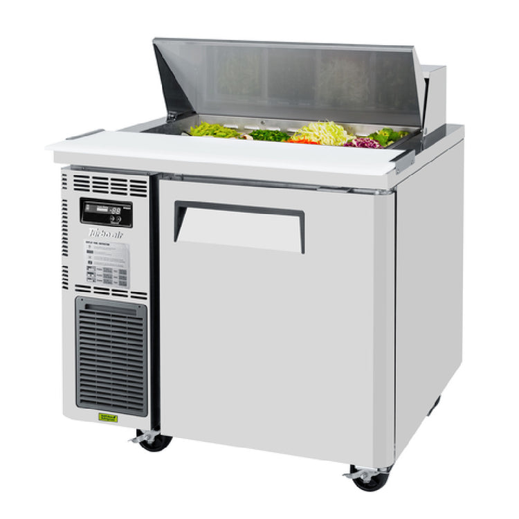 Turbo Air, JST-36-N, J Series Sandwich/Salad Unit, one-section, front air intake, side mount self-contained compressor, 35-3/8"W x 27-1/2"D x 35-3/4"H, 7.5 cu. ft., 8-pan top opening with hood, (1) stainless steel swing door, (1) PE coated wire shelf, 9-1/2" deep cutting board with side rail, digital temperature control, stainless steel top, front & sides (galvanized steel back & bottom), stainless steel interior floor with aluminum side panels & door liner, LED interior lighting & fan control, R290 Hydrocarbon refrigerant, 1/3 HP, 115v/60/1-ph, 2.4 amps, NEMA 5-15P cETLus, ETL-Sanitation