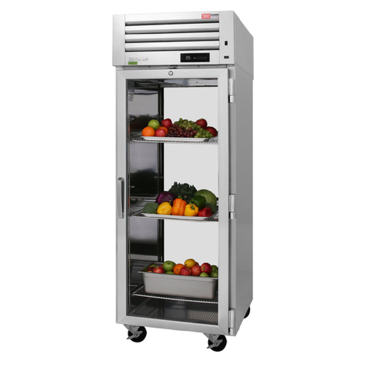 The Turbo Air PRO-26R-GS-PT-N(-L) features a self-contained, top-mounted refrigeration system powered by a 1/2 HP compressor, operating on 115V AC at 60Hz with a maximum current draw of 7.0 amps. Its air-cooled condenser efficiently dissipates heat, supporting consistent internal temperatures within a typical range suitable for perishable product storage. The unit’s exterior and interior are made of stainless steel, with galvanized top and bottom panels for additional strength. It measures 28.75 inches in width, 36.25 inches in depth, and 78 inches in height, weighing approximately 416 lbs. The refrigerator includes a glass and solid hinged door configuration with locks, three stainless steel wire shelves, and LED lighting for visibility. It maintains compliance with sanitation standards through its ETL-Sanitation approved design and features a hot gas condensate system for reliable operation. Designed for moderate workload environments, it’s suitable for installation in commercial kitchens, cafeterias, and convenience stores, with minimum clearances and routine cleaning necessary for optimal operation.