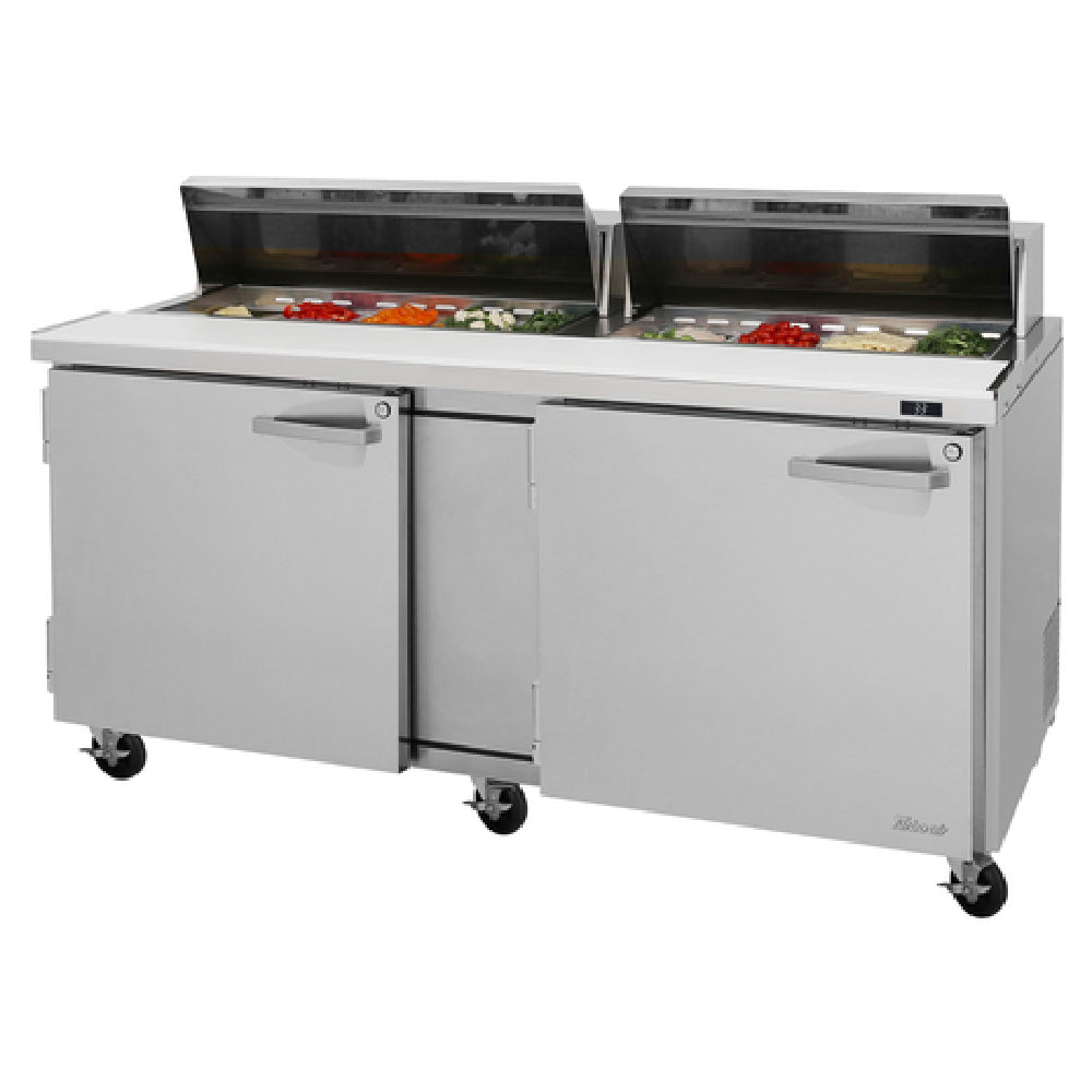 The Turbo Air PST-72-N(-AL) PRO Series includes a two-section design with rear-mounted self-contained refrigeration, ensuring easy maintenance and consistent cooling. Heavy-duty stainless steel construction guarantees durability in demanding commercial settings. The 18-pan top offers efficient food presentation and quick access, while the digital control system provides precise temperature regulation. Designed for moderate workload applications, this prep table enhances workflow efficiency by integrating a 9-1/2" deep cutting board with side rail, supporting food prep speeds. Its modular shelves and hinged doors streamline sanitation and storage, suitable for busy foodservice operations.