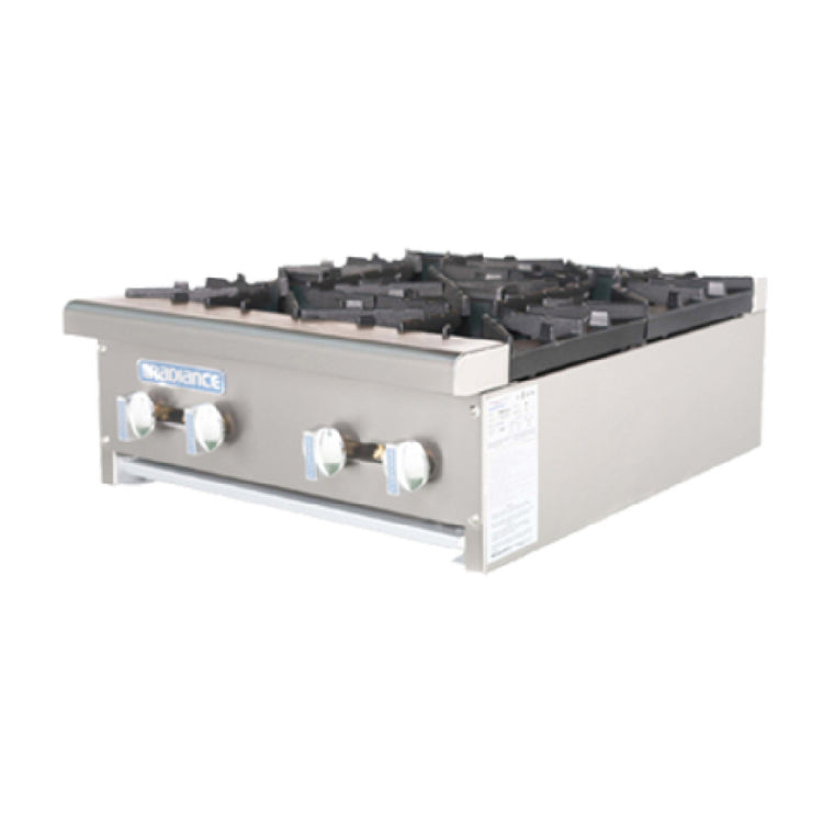 Turbo Air, TAHP-24-4_NAT, Radiance Hotplate, countertop, gas, 24" wide, (4) 32,000 BTU burners, manual controls, removable grease pan, 16 ga. stainless steel front plate & wrap, heavy duty removable cast iron, grooved top design, adjustable standing pilots, bullnose stainless steel front extension, heat resistant on-off knob, 2" stainless steel standard legs, regulator included, total 128,000 BTU, CSA, CSA-Sanitation