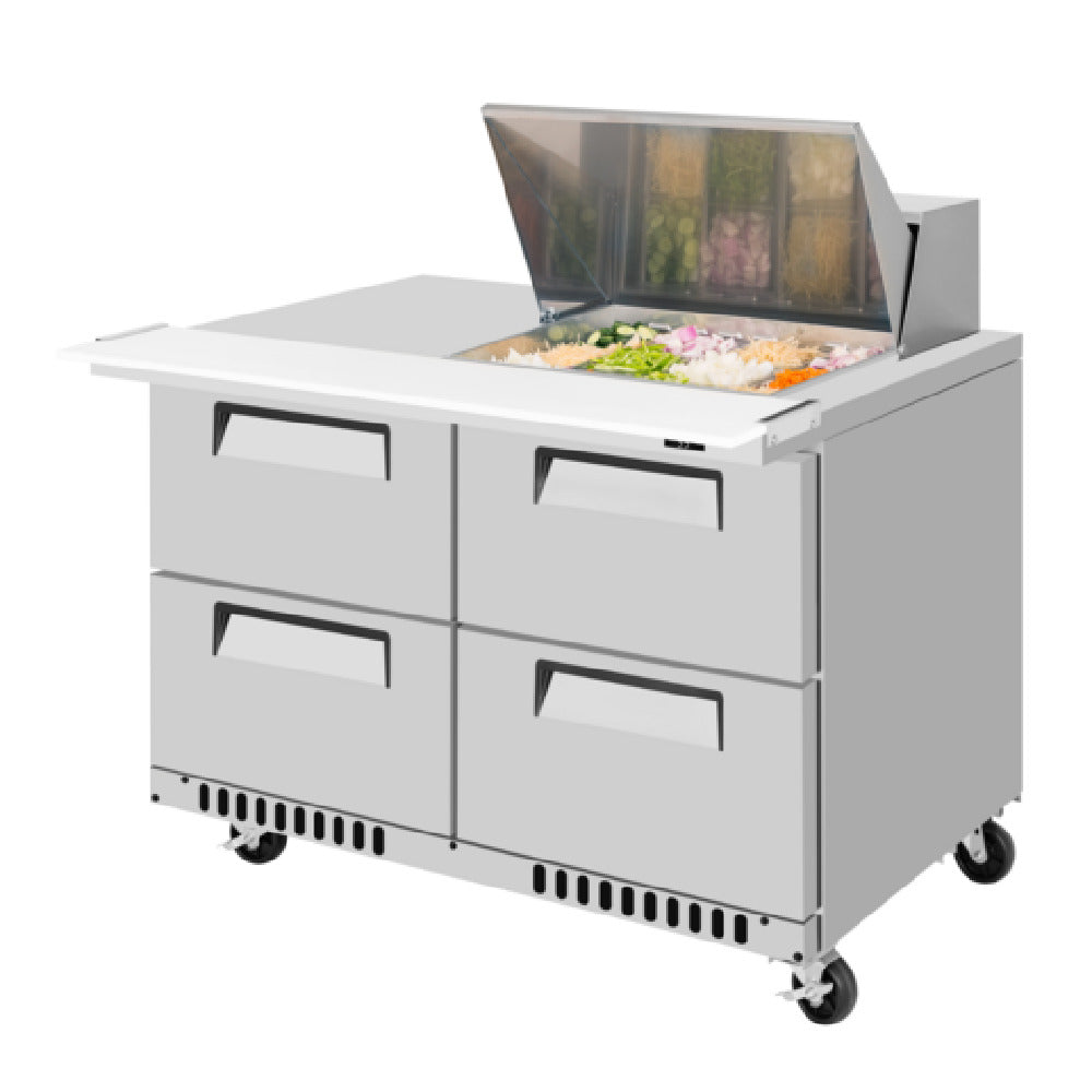 The Turbo Air TST-48SD-12M-D4-FB-N(-LW) Super Deluxe Series/Prep Table Workstation Drawers is a commercial refrigeration unit designed for high-volume foodservice operations. This two-section prep table features front breathing airflow and a spacious 48-1/4" width, providing optimal temperature stability for prepared ingredients. Equipped with (12) 1/6 size, 4" deep pans and (4) drawers, it supports efficient ingredient organization, while the insulated pan cover maintains product freshness. The unit's 9-1/2" cutting board allows for seamless food prep, and the digital temperature control system offers precise monitoring. Constructed with stainless steel interior and exterior (plus galvanized steel back and bottom), it ensures durability in demanding kitchen environments. Overall, this model delivers reliable performance with a 1/5 HP compressor operating at 115V/60Hz, making it suitable for mid-volume establishments requiring consistent cold storage and prep functionality.