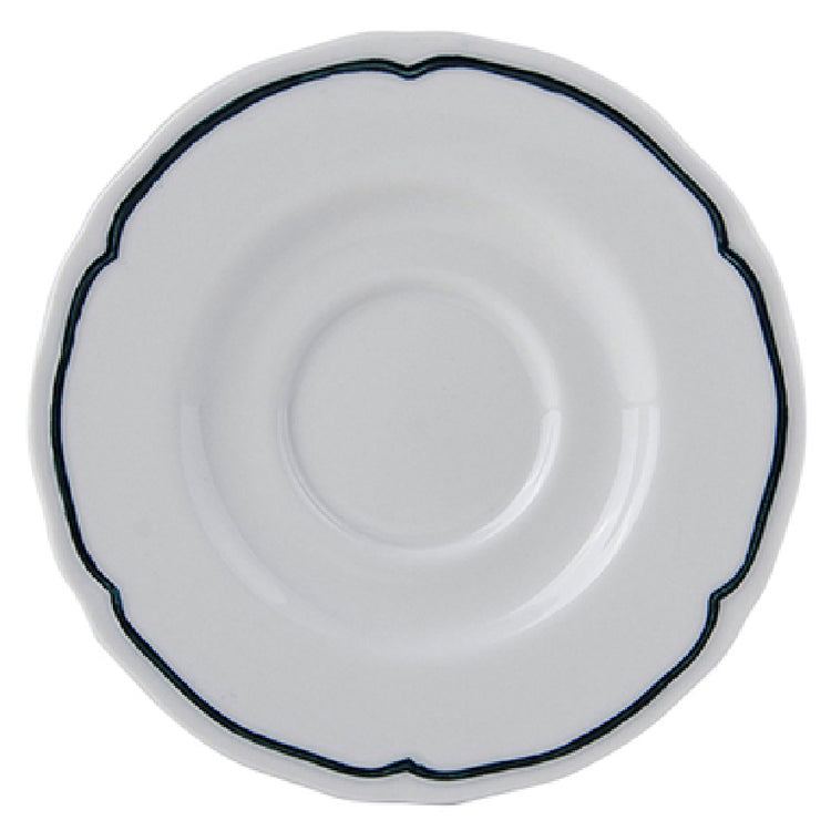 Tuxton SBE-050 5 Inch Diameter Round Saucer with Scalloped Edge Porcelain White Blue Band - 3 Dozen/Case