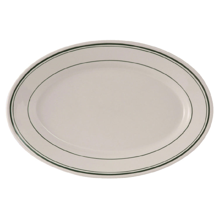 Tuxton TGB-013 11 Inch Platter Oval Wide Rim Rolled Edge Ceramic Green Band - 1 Dozen