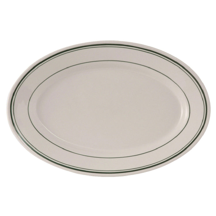 Tuxton TGB-042 15-3/4 Inch Oval Platter Ceramic American White with Green Band - 6/Case