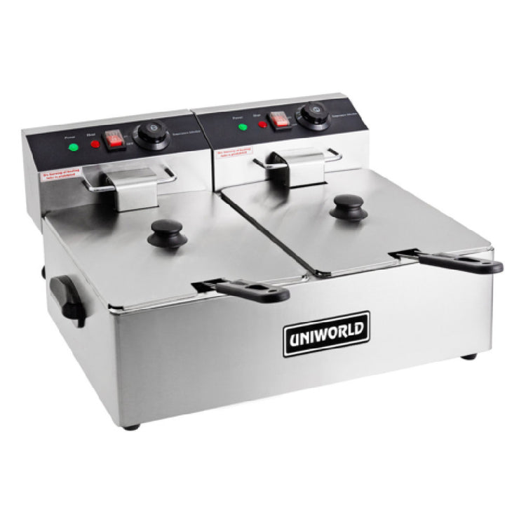 A commercial fryer is a food preparation appliance designed for high-volume frying of foods such as fries, chicken, and other battered or breaded items. It typically features a durable, stainless steel construction, multiple wells for simultaneous frying, and precise temperature controls for consistent results. Installed in restaurant, cafeteria, or fast food environments, this type of fryer supports efficient workflow and quick service. The Uniworld Food Service Equipment UEF-08L2 Economy Fryer Countertop Electric is tailored for medium-volume settings, offering two 10-liter stainless steel wells with adjustable thermostats, making it suitable for versatile foodservice operations that demand quality and reliability.
