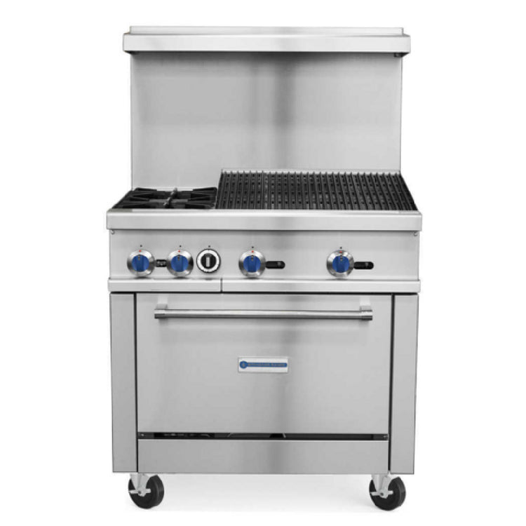 USR Brands, SR-R36-24CB, Standard Range Restaurant Range, natural gas, 36"W, (2) 30,000 BTU cast iron open burners, 24" char-broiler top, standard oven with U-shape 33,000 BTU/hr burner, thermostat controlled, 200° to 500°F temperature range, thermal coupling safety valve, standby pilot, pull-out crumb tray, welded frame, stainless steel handle & oven door, kick plate, stainless steel front, sides, back riser & shelf, adjustable legs, 163,000 BTU, CSA, cCSAus, CSA-Sanitation