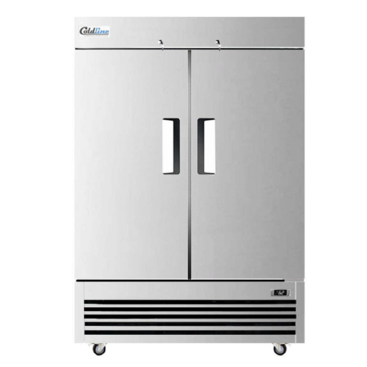 USR Brands, T-2FE, Coldline Freezer, reach-in, one-section, 54"W, 41.9 cu. ft. capacity, bottom mounted self-contained mounted refrigeration, (2) self-closing solid hinged locking door with 90° stay open feature, (6) epoxy-coated adjustable wire shelves, -8° to 0°F temperature range, digital temperature control, automatic defrost, LED interior light, stainless steel front & sides, aluminum back, 304 stainless steel interior, (4) casters (2 with brakes), R290 Hydrocarbon refrigerant, 1 HP, 115v/60/1-ph, 8.7 amps, cord, NEMA 5-15P, cETLus, ETL-Sanitation, Certified to NSF Standard