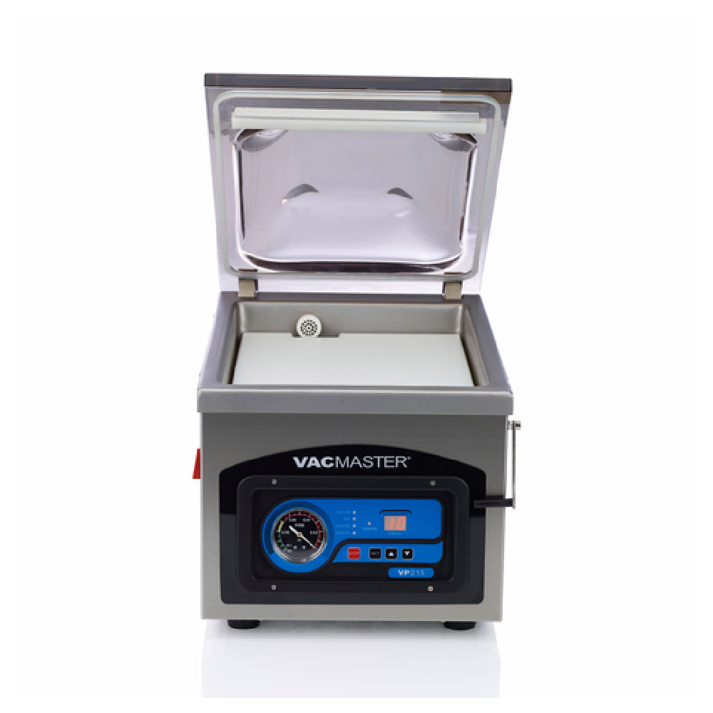 VacMaster, VP215, VacMaster™ Chamber Vacuum Sealer, countertop, 10" removable seal bar with double seal wire, 11-1/4" x 15-1/4" x 5" chamber, easy-to-use digital control panel, vacuum & seal, seal time, & pressure indicator, 20-40 seconds cycle time, heavy-duty transparent lid, stainless steel body, 1/4 HP rotary oil pump, includes filler plates, user guide, maintenance kit, & (75) assorted chamber pouches, 110v/60/1-ph, 4.0 amps