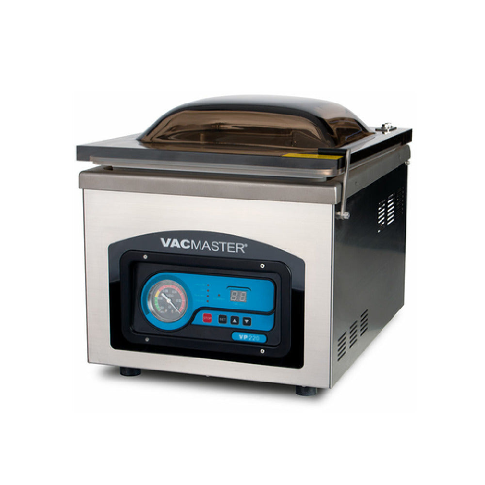 VacMaster, VP220, VacMaster™ Chamber Vacuum Sealer, 15-1/2" W x 19" D x 15-3/4" H, countertop, 12-1/4" removable seal bar with double seal wire, 12-1/2" W x 15" D x 5" H chamber, adjustable time settings, easy-to-read pressure indicator, stop and seal at any time, 20-40 seconds cycle time, heavy-duty transparent lid, includes lid lock, stainless steel body, maintenance-free air pump, includes filler plates, (45) assorted chamber pouches, user guide, 110v/60/1-ph, 4.0 amps