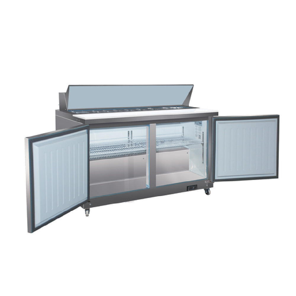 Valpro Commercial Refrigeration, VP60S-HC, Sandwich/Salad Top Refrigerator, two-section, 61"W, 16 cu. ft. capacity, auto defrosting & evaporation, digital thermostat with LED display, (2) solid hinged self-closing doors, stainless steel insulated cover, 61"W x 11-1/2"D white removable cutting board, (2) adjustable epoxy coated wire shelves (one per section), 430 stainless steel top, front & sides, white ABS interior, 304 stainless steel floor, includes (16) 1/6 size polycarbonate pans, (4) casters, R290 Hydrocarbon refrigerant, cord with NEMA 5-15P, 1/2 HP, 115v/60/1-ph, 4.3 amps, ETL, ETL-Sanitation