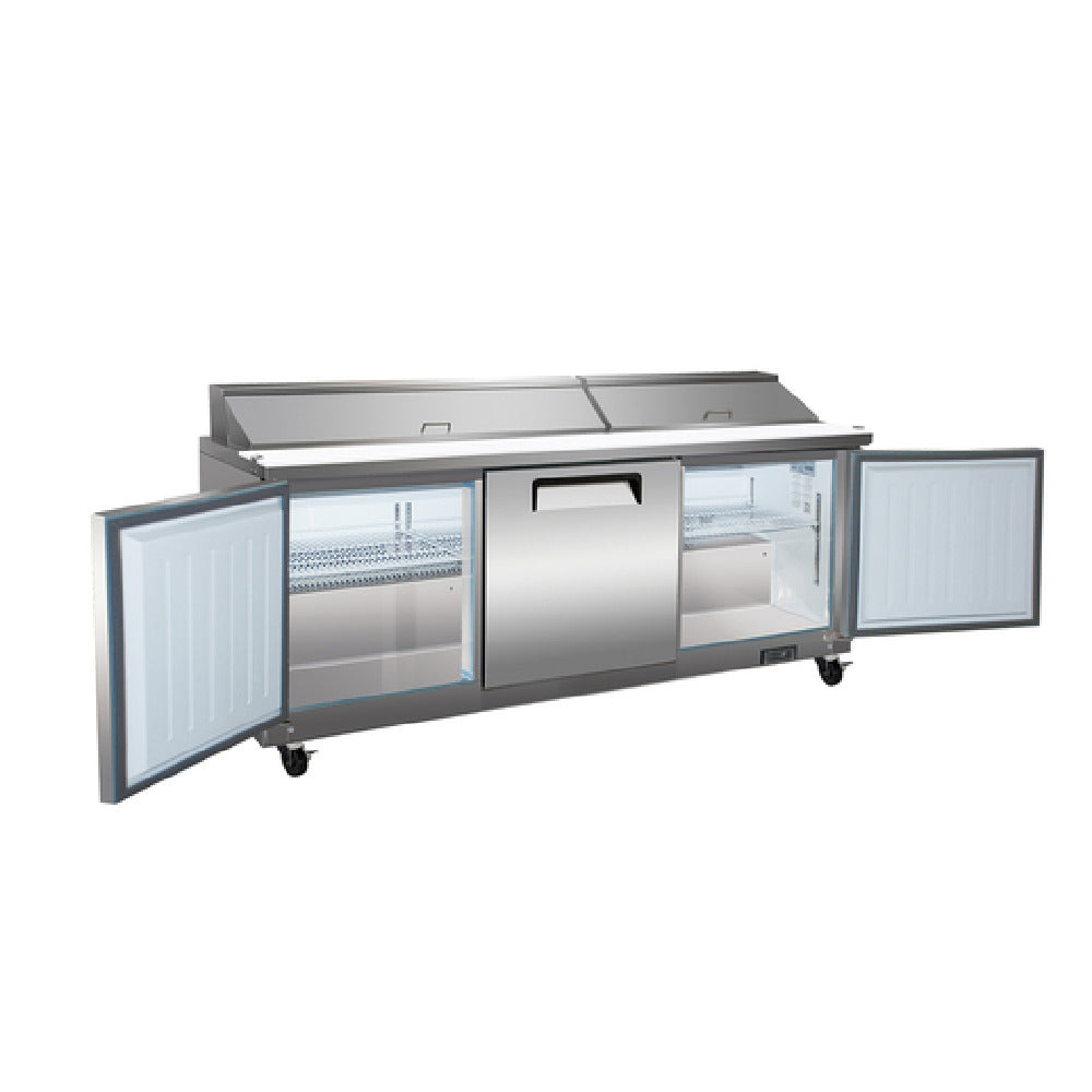 The Valpro VP72S-HC Sandwich and Salad Top Refrigerator is a commercial-grade refrigeration unit designed for high-volume foodservice environments requiring versatile cold storage and display. This three-section refrigerated counter measures 72 inches in width and features a self-contained, rear-mounted refrigeration system. Its precise digital thermostat with LED display ensures accurate temperature control, while auto defrosting and evaporation optimize maintenance. Constructed with an all-stainless steel exterior and a white ABS interior, it offers durability and easy cleaning, complemented by a stainless steel insulated cover and a sturdy food-grade floor. Equipped with adjustable epoxy-coated wire shelves, hinged self-closing doors, and caster wheels for mobility, the VP72S-HC supports efficient workflow in busy kitchens, cafeterias, and catering operations. It includes polycarbonate pans for effective food organization and presentation, handling up to 18 quarts of product capacity. Powering this unit is a 1/2 HP compressor operating on 115V/60Hz electricity with a 5-15P plug, utilizing R290 hydrocarbon refrigerant for environmentally friendly cooling.
