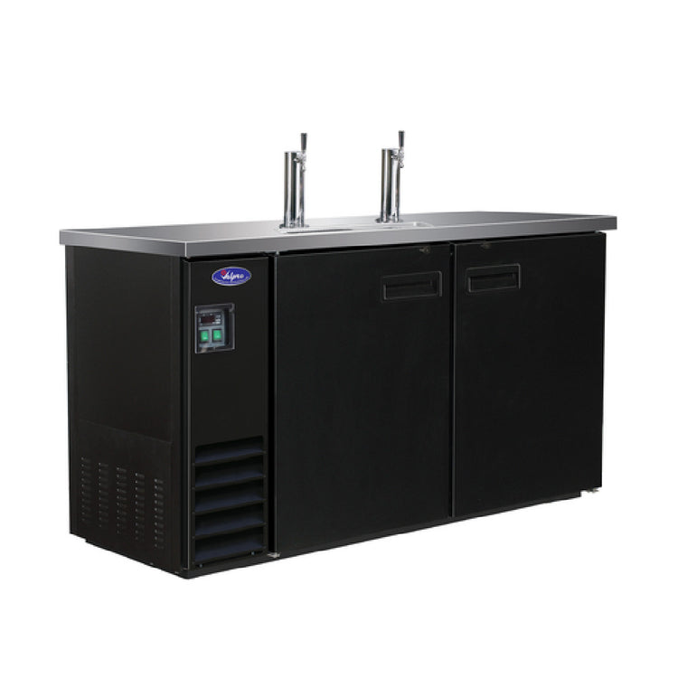 The Valpro VPBD3-2 Direct Draw Beer Dispenser is a commercial-grade draft beer cooler designed for efficient beverage presentation in hospitality settings. Featuring a two-section configuration with a total capacity of 14.16 cubic feet, this unit is built with side mount self-contained refrigeration for consistent temperature control. The product includes two refrigerated towers, each equipped with a tap, facilitating simultaneous dispensing and streamlined service. Its durable stainless steel top surface combined with an all-black exterior finish ensures both longevity and a professional appearance. The electronic thermostat coupled with a digital LED temperature display allows precise temperature adjustments, critical for maintaining optimal draft beer quality. Dimensions are approximately 61.1" wide by 24.4" deep and 36.2" high, with a weight of 304 lbs, making it suitable for medium-volume beverage operations requiring reliable capacity management. The unit’s features, such as LED lighting and self-closing doors, enhance usability and sanitation in commercial environments.