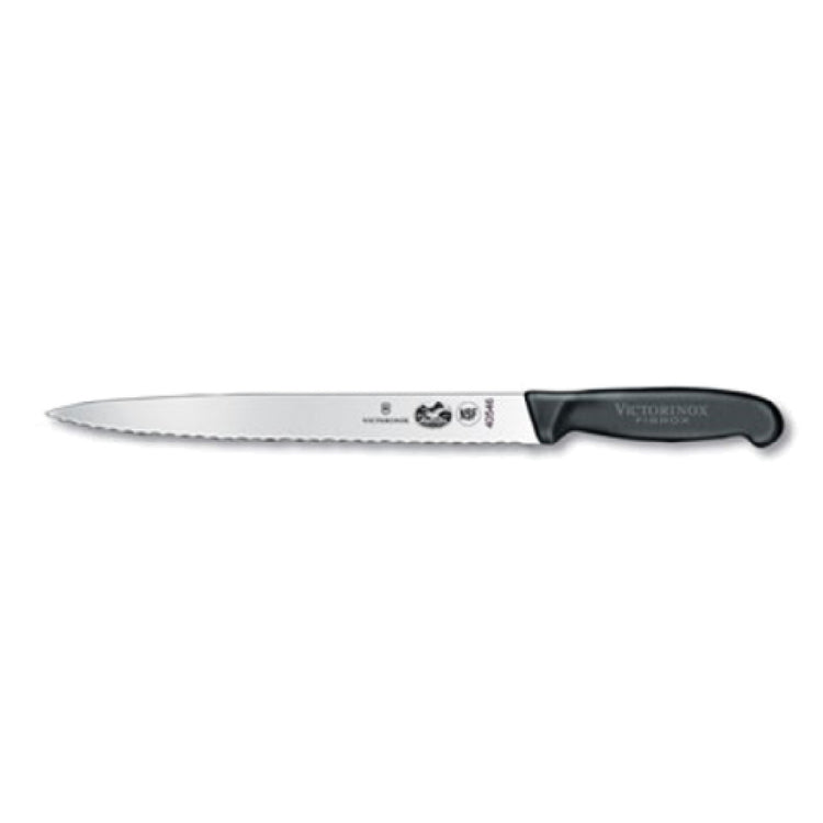 A commercial slicer knife is a high-performance cutting tool designed for professional foodservice environments, featuring a long, semi-flexible stainless steel blade with specialized edge geometry for efficient slicing of cooked or cured foods. The Victorinox 5.4433.25 slicer knife is used in deli counters, butcher shops, and large-scale kitchens to produce uniform slices of meats, cheeses, and baked goods, making it an essential component of high-volume food preparation and presentation. Its pointed, wavy-edged blade enhances cutting precision, facilitating faster, safer, and cleaner slicing operations for applications demanding speed and consistency.