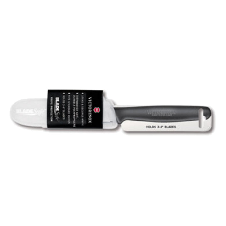 The Victorinox BladeSafe™ Knife Holder features a lightweight, 0.05 lbs plastic construction designed for durability and ease of handling. Its dimensions support blades up to 4-1/2" long, suitable for various kitchen knives. The product is made in the USA and dishwasher safe, ensuring straightforward cleaning and sanitation. Its universal design allows flexible integration into different storage setups, with a hanging package for convenience. The material's temperature resistance and robust construction provide long-lasting performance in a busy commercial environment. This guard enhances safety, reduces blade damage, and streamlines knife management in professional foodservice operations.