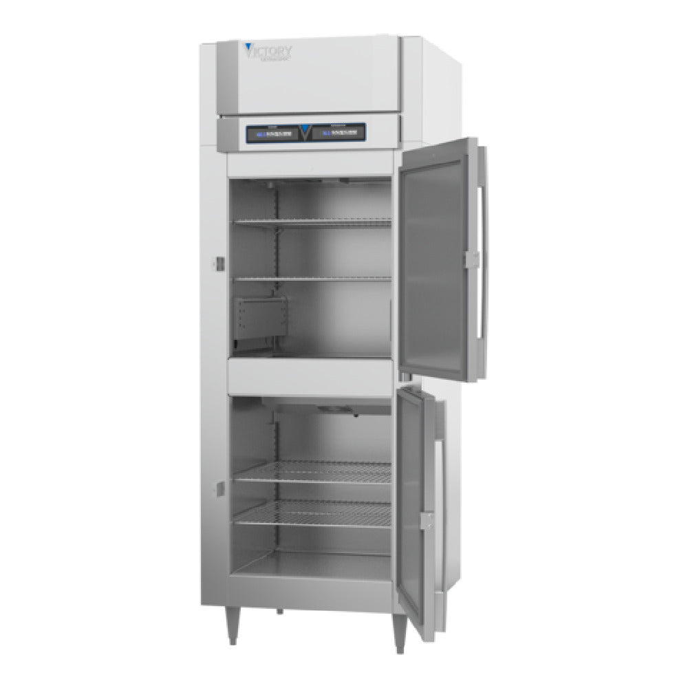 The Victory HRS-1D-S1-EW-HD-HC UltraSpec™ Series Dual Temp Warmer/Refrigerator is a commercial-grade reach-in cabinet configured with self-contained refrigeration and dual temperature zones. Designed for professional foodservice environments, it features a 10.1 cu. ft. capacity per section, equipped with wide hinged doors for easy access. The unit incorporates Touch Point™ electronic temperature controls, exterior digital thermometers, and features corrosion-resistant stainless steel exterior and interior construction. Powered by the innovative V-Core™ technology, it offers precise temperature regulation and energy efficiency, utilizing environmentally friendly R-290 hydrocarbon refrigerant. The top-mounted compressor enhances accessibility and simplifies maintenance, making it suitable for mid-volume operations requiring reliable temperature management and durable performance.
