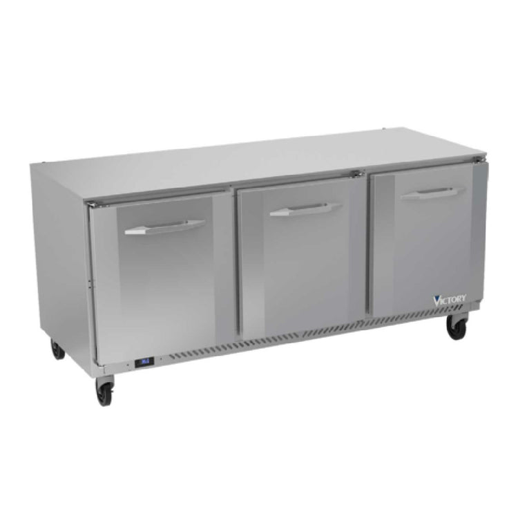 The Victory VUR72HC Undercounter Refrigerator Powered By V-Core™ is a commercial-grade refrigeration unit designed for high-efficiency storage in professional foodservice environments. Featuring a three-section configuration and 72" width, it offers a 17.88 cubic foot capacity suitable for restaurant, bar, and hospitality operations. Its rear-mounted self-contained refrigeration system utilizes R290 hydrocarbon refrigerant, ensuring optimal cold retention with environmentally conscious efforts. Constructed with durable stainless steel on the exterior—including a 1/2" thick stainless steel top and stainless steel hinged doors—and an aluminum interior, this unit combines resilience with ease of cleaning. The full electronic control enables precise temperature management, while epoxy-coated wire shelves facilitate easy sanitation and long-term durability. The VUR72HC is engineered for reliable performance and streamlined workflow in commercial kitchens requiring undercounter refrigeration solutions with high accessibility and sanitation standards.