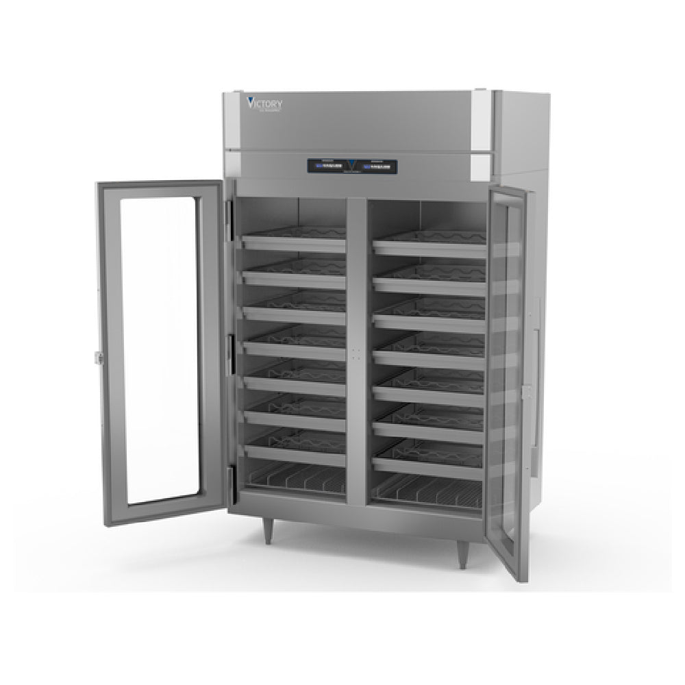 Victory Refrigeration, WCDT-2D-S1-HC, Dual Temperature Refrigerated Wine Cooler, Powered by V-Core™, two-section, top mount self-contained refrigeration, (2) 21.01 cu. ft. capacity compartments, holds (160) wine bottles, (2) locking hinged glass doors, (7) adjustable shelves per door, insulated partition, digital temperature display/controls, LED lighting, expansion valve technology, adaptive defrost, top mounted air cooled refrigeration, stainless steel construction, (2) 1/3 HP, cULus, UL EPH Classified, UL-Sanitation, MADE IN USA