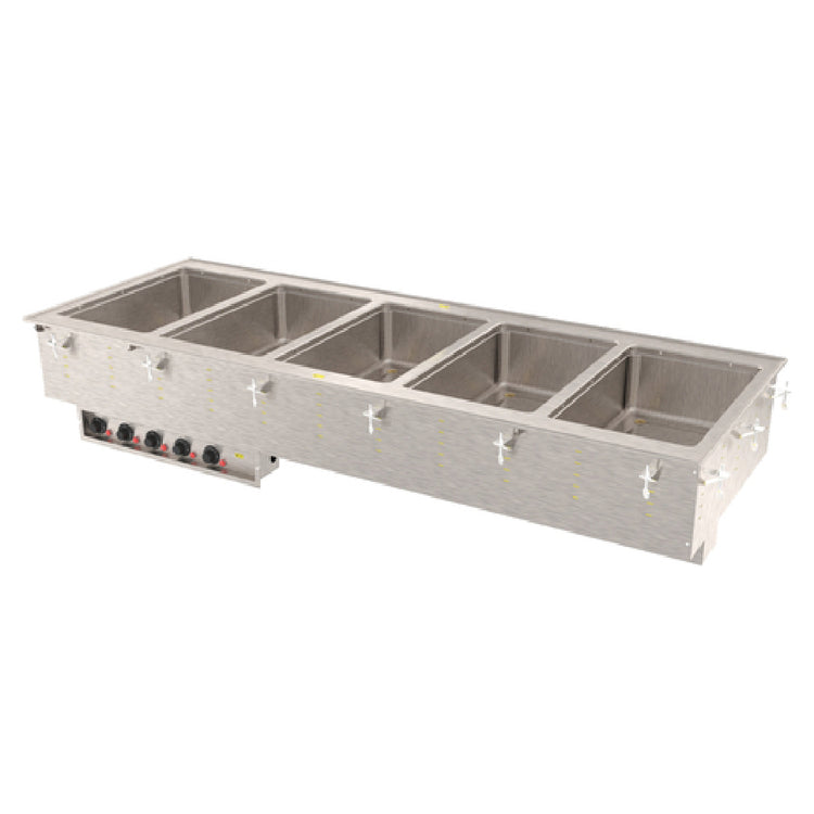 Vollrath, 3640880HD, Hot Food Well Unit, Drop-In, electric, (5) 12" x 20" individual 20 gauge/316 marine grade stainless steel insulated wells, 68"W x 26"D x 21-1/2"H (overall), wet operation only, auto-fill, individual thermostatic controls mounted in panel with cord, power indicator light, drip-free flange, 1" copper manifold drain with individual well shutoffs & manifold shutoff, 18 gauge stainless steel top, stainless steel exterior housing, includes positioning clips, 3125 watts, 208v/60/1-ph, 15.0 amps, cord with NEMA 6-20P, NSF, cULus, Made in USA (67-1/4"W x 25-1/4"D cutout size, requires 7/8" corner radius)