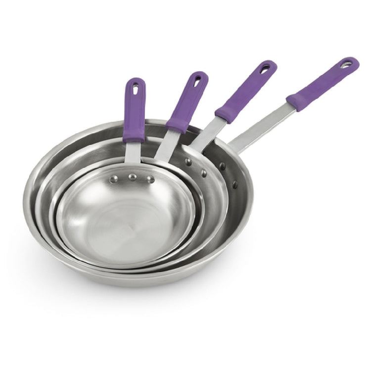 The Vollrath 401080 Wear-Ever® Aluminum Fry Pan 10" (25.4 cm) with Natural Finish is a commercial-grade cookware essential for professional kitchens requiring durable, high-performance frying solutions. Crafted from uncoated, heavy-gauge aluminum, this fry pan provides excellent heat conduction suitable for stovetop and oven applications. Its natural finish ensures consistent cooking results, making it a reliable choice for foodservice operations that demand precise temperature control and uniform browning. Key features include a removable purple silicone insulated handle rated at 450°F for versatile use, and an innovative EverTite™ Riveting System that enhances handle stability, ensuring longevity in demanding kitchen environments. With a 7-5/8" bottom diameter and an inside height of 2 inches, this pan is ideal for medium-volume fry and saute tasks, offering a functional balance between size and maneuverability. Made in the USA, it combines technical reliability with professional performance in commercial kitchens, culinary institutes, and catering services that prioritize quality cookware with technical excellence.