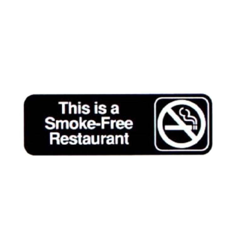 The Vollrath 4524 This Is A Smoke-Free Restaurant Sign is a compliance signage product designed for commercial foodservice environments to clearly communicate smoke-free policies. Measuring 3" x 9" and featuring a high-contrast white on black color scheme, this sign ensures visibility in various restaurant, cafe, and hospitality settings. Crafted in the USA from durable materials, it provides an effective, permanent visual communication tool suitable for installation in kitchens, dining areas, or entry points. Its technical composition emphasizes structural integrity and legibility, making it an essential component of restaurant compliance signage with precise dimensions of 3 inches in height and 9 inches in width.