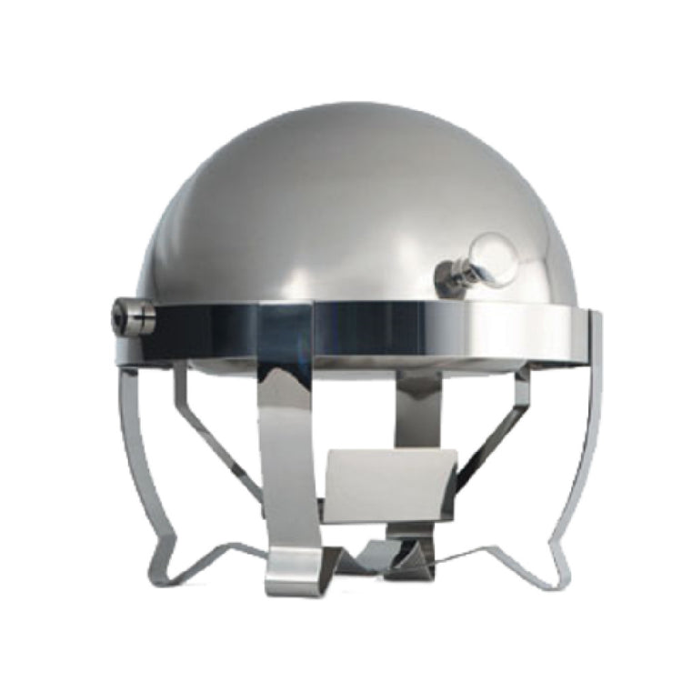 Vollrath, 46530, Orion® Retractable Round Roll Top Chafer, 6 quart, 18-10 stainless, Mirror Finish, with stand, 6 quart, food pan with center well, water pan, (1) fuel holder with wind guard, cover retracts from 90° to fully open position, 18-1/2"H(closed)x18"W, imported