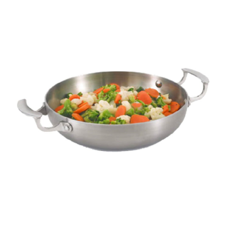 The Vollrath 49424 Miramar™ Display Cookware French Omelet Pan is a professional-grade culinary tool designed for commercial kitchens requiring precise thermal conduction and durable construction. With a capacity of 3-1/16 quarts and a 10-1/4" diameter, this pan is ideal for preparing delicate omelets or similar egg-based dishes. It features a three-ply construction with an 18-8 stainless steel interior and an 18-0 stainless steel exterior, supported by a 3004 aluminum core in the bottom and side walls, ensuring even heat distribution. Its satin finish interior and exterior, complemented by welded mirror finish handles, provide a sanitized surface suitable for high-volume food preparation across gas, electric, or induction ranges. This pan is engineered for consistent performance and easy maintenance in busy commercial environments.