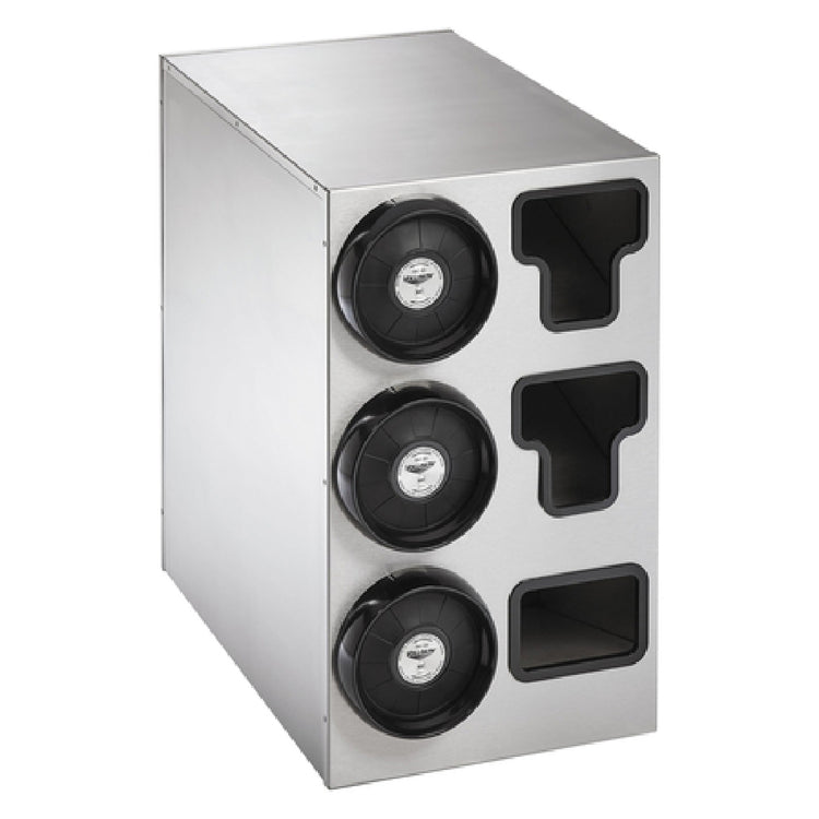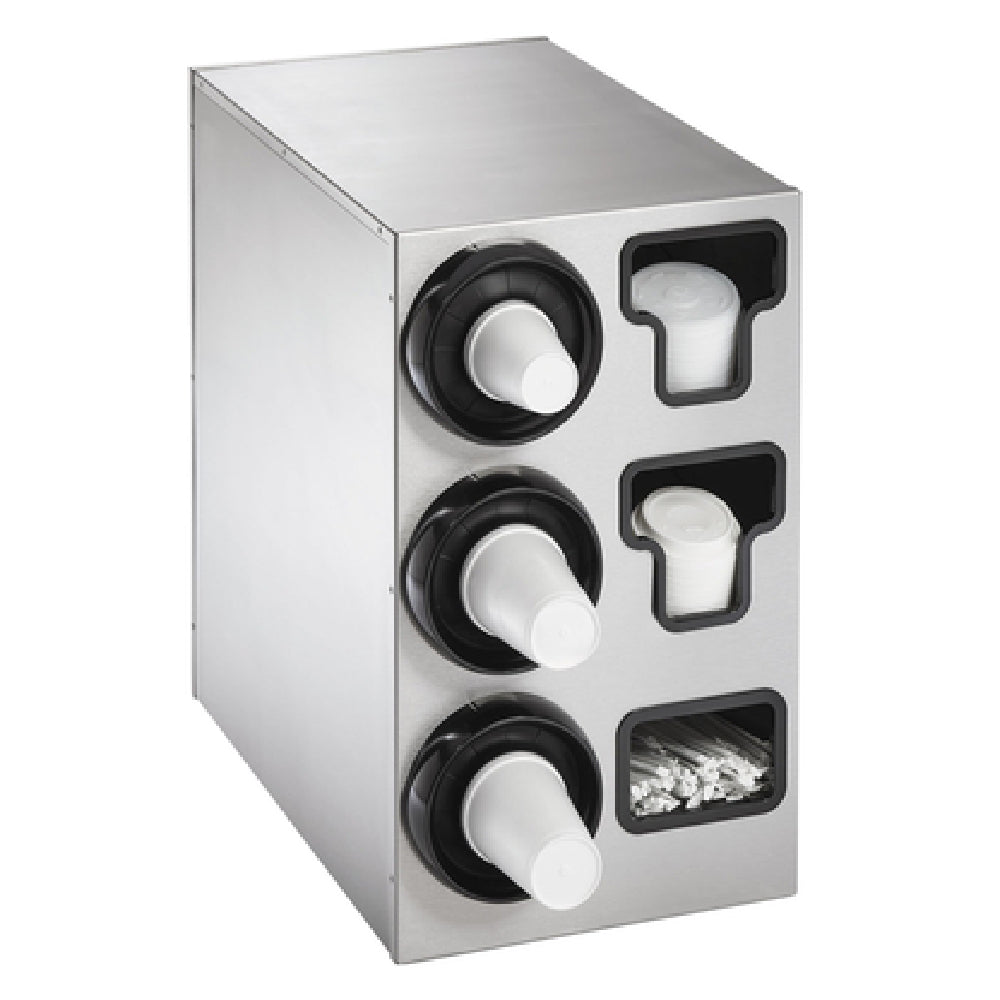 Vollrath, 58833, Cup Dispenser, vertical, countertop, (3) high, 14-1/4"W x 23-1/4”D x 24"H, accommodates (4) sleeve of cups (rim diameters 2-1/4" - 4-3/4”), (2) "T" lid holders & (1) straw pocket, includes: (3) INC-80, stainless steel (made to order)