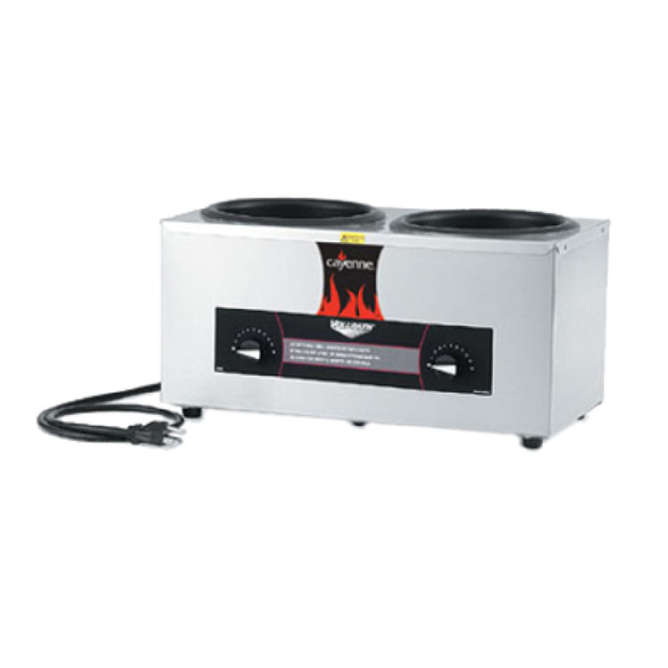The Vollrath 72045 Cayenne® Twin Well Rethermalizer Countertop is a commercial-grade heating appliance designed for precise food holding and rethermalization in professional kitchens. This countertop unit measures 17-1/4 inches in length, 9-1/4 inches in width, and 8-3/4 inches in height, featuring dual coated aluminum wells for even heat distribution and rapid recovery. Equipped with front thermostatic controls, it enables independent temperature adjustment for each well, ensuring optimal food temperature maintenance. Constructed with durable stainless steel exterior, this model is suitable for high-use foodservice environments and allows seamless integration into busy food prep or service stations. Its specifications include a 120v/60/1-ph electrical supply, 9.2 amps, and 1100 watts, providing consistent performance for dynamic kitchen workflows.