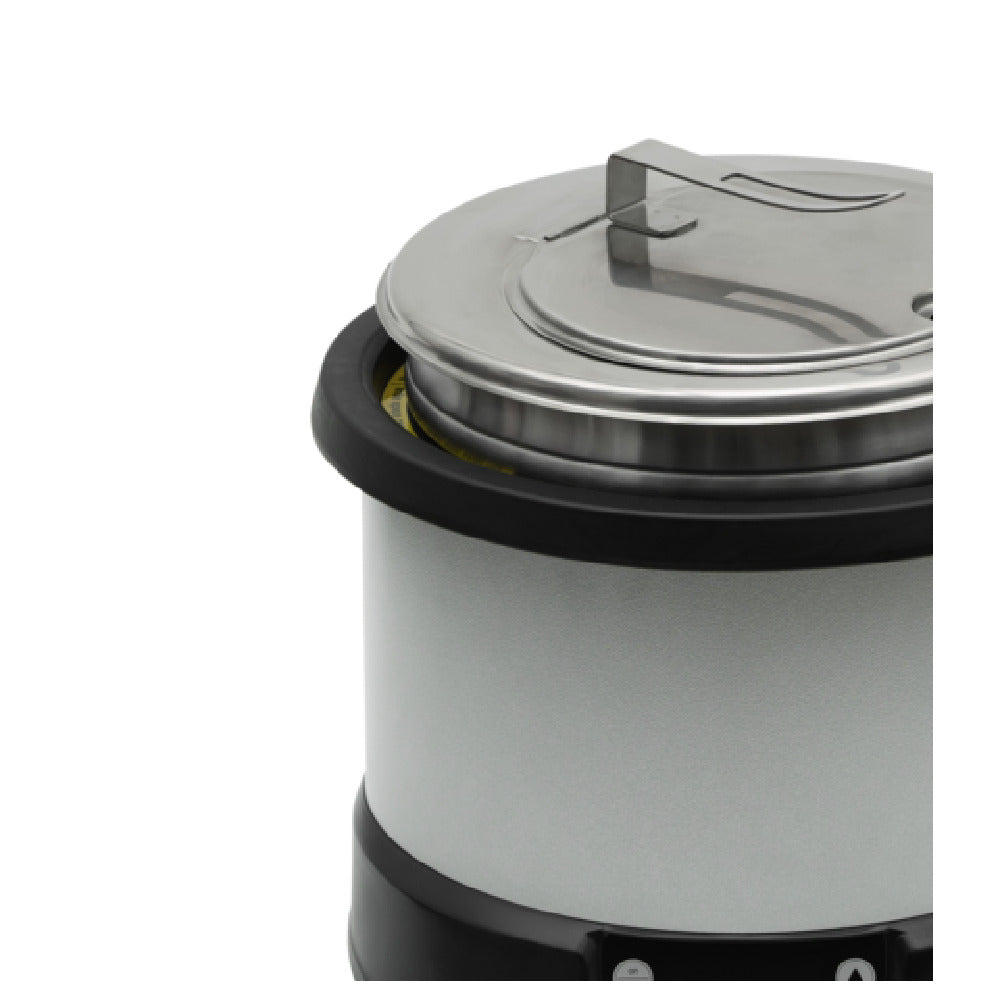The Vollrath 74110310 induction rethermalizer operates on a 230V supply with CE approval, delivering 800W of power at 3.5 amps. Its compact dimensions of 13.9 inches in width and depth, with a height of 13.43 inches, allow it to fit seamlessly into cramped counter spaces. Made from durable stainless steel, it features a self-contained design optimized for dry operation, with an operating temperature range suitable for reheating a variety of foods. The unit weighs approximately 14.14 lbs and includes an induction-ready inset that accommodates an 11-quart round pan. Its controls are digital, providing precise temperature adjustments, and the stir indicator LED assists in monitoring operation. Easy to clean and maintain, the design aligns with commercial kitchen workflows needing consistent performance and safety standards.