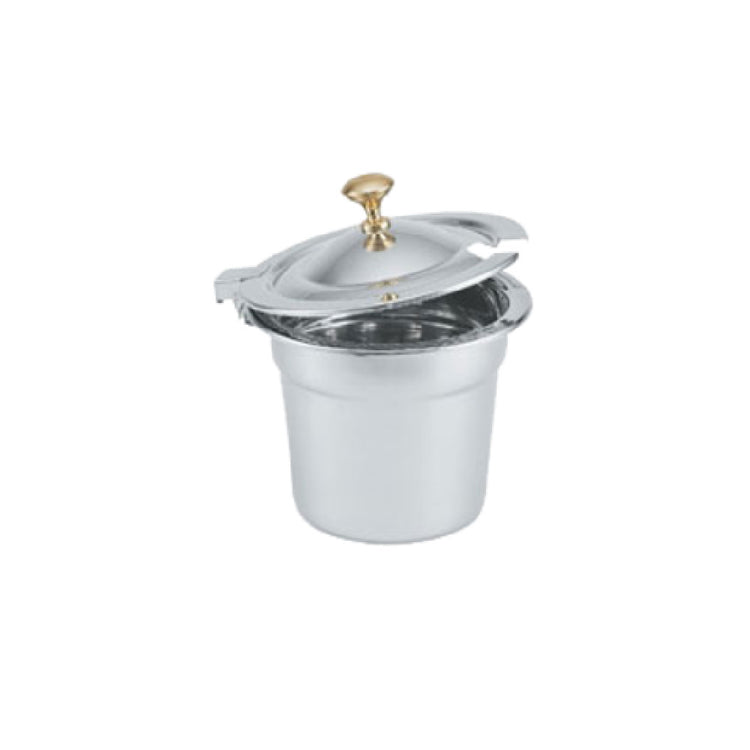 A commercial soup inset is a foodservice-ready, stainless steel container designed to hold, display, and serve hot or cold liquids within buffet or steam table setups. The Vollrath 8231220 Miramar™ Decorative Soup Inset is a round, 10-quart capacity insert constructed from durable 18-8 stainless steel, optimized for consistent thermal presentation and ease of maintenance. Installed in high-volume catering, buffet lines, or restaurant operations, it ensures food is kept at the appropriate temperature while maintaining a polished appearance. This decorative inset is ideal for upscale presentation in foodservice venues, supporting efficient workflow and sanitation standards.