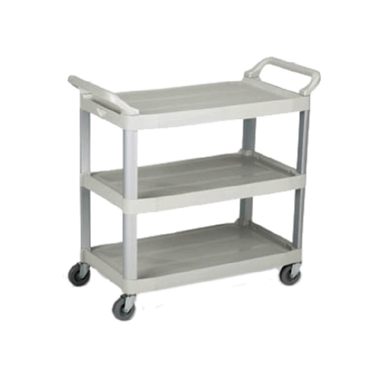 A commercial utility/bussing cart is a heavy-duty, multi-purpose transport solution designed for high-volume foodservice environments. Equipped with durable polypropylene shelves and aluminum uprights, the Vollrath 97005 model provides a resilient platform for carrying dishes, supplies, or cleaning tools. Measuring 40-1/4 inches long by 19-7/8 inches wide and 37 inches high, it supports up to 300 pounds. Used in restaurants, catering, and institutional kitchens, this cart offers efficient mobility with swivel casters, ensuring smooth operation during busy service times and repetitive transport workflows.